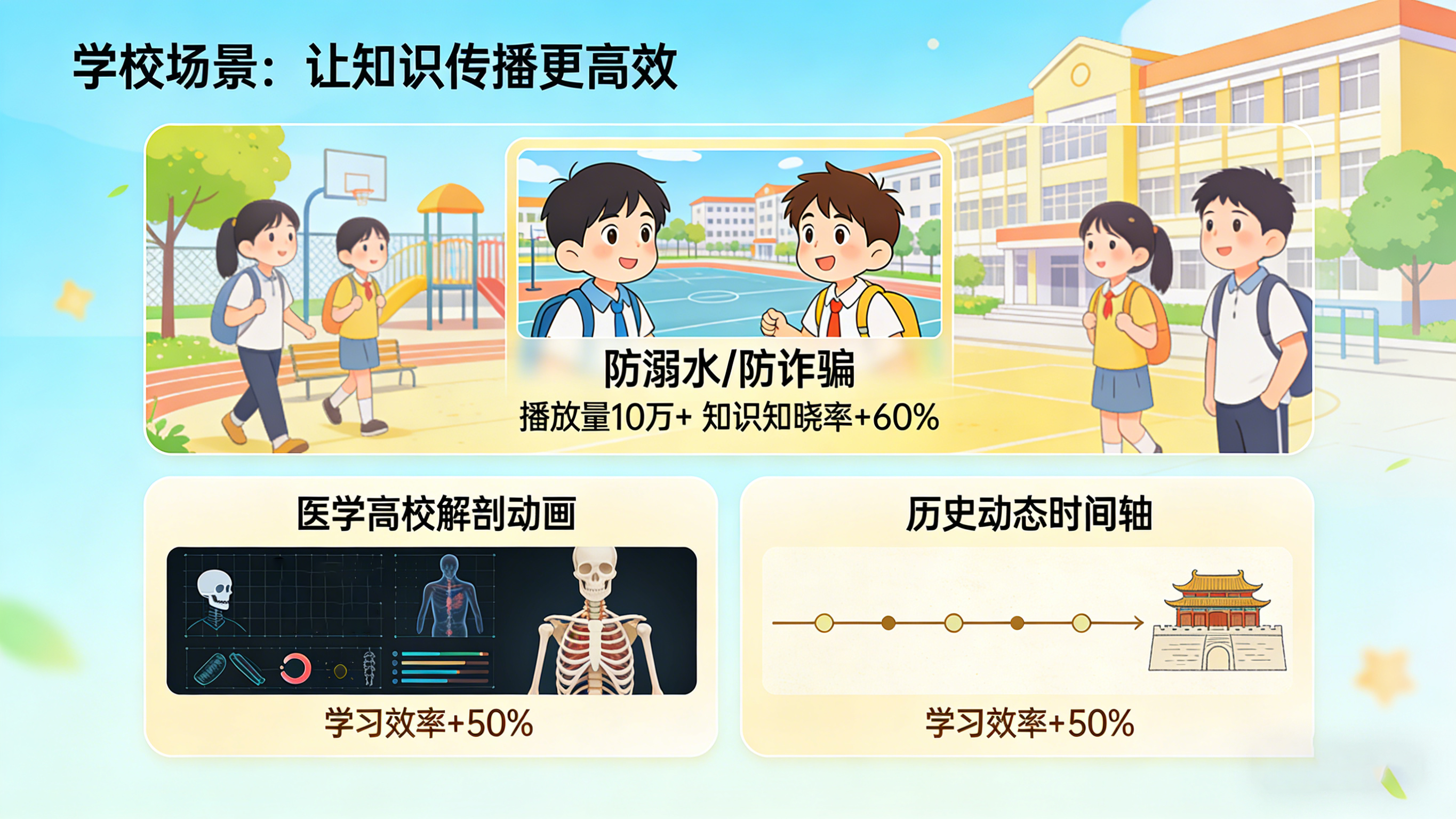 中小学安全教育、高校专业教学常面临 “形式单一、吸引力弱” 的痛点。某中学通过青谷软件定制的防溺水、防诈骗MG动画,将安全知识融入卡通剧情,学生观看热情高涨,知识知晓率提升60%,校园平台播放量破10万+。